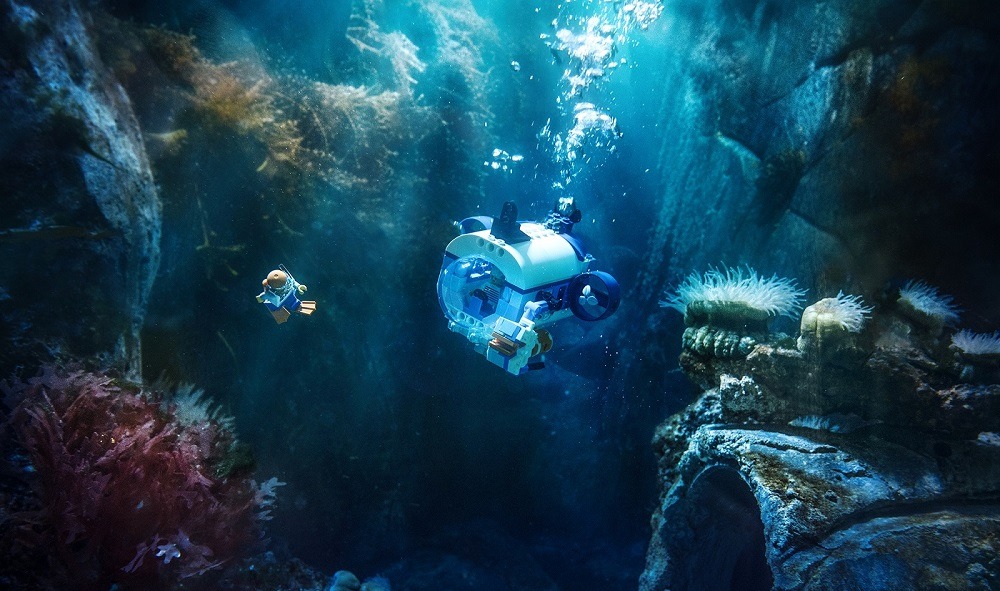 A LEGO búvár és tengeralattjáró merülése rögtön egy kreatív megoldással kezdődött; a fotós egy műanyag bot segítségével stabilizálta a járművet az akváriumban, és hogy még inkább érzékeltesse a víz alatti környezetet a fotókon, egy szilikoncsövet használt buborékfújásra – ezt a feladatot később felváltotta az akvárium buborékoló levegőztetője.